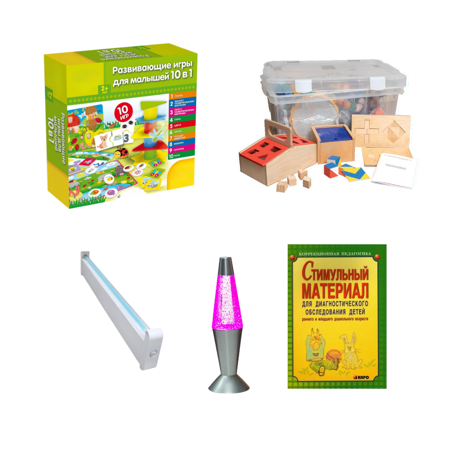 | Комплектация | 1. Игра или игрушка для развития игровой деятельности. 2. Комплект для психолого-педагогического обследования детей с нарушением интеллекта. 3. Методическая литература. 4. Облучатель бактерицидный настенный. 5. Светильник-релаксант разноцветный настольный. 6. Стимульный наглядно-дидактический материал. |
