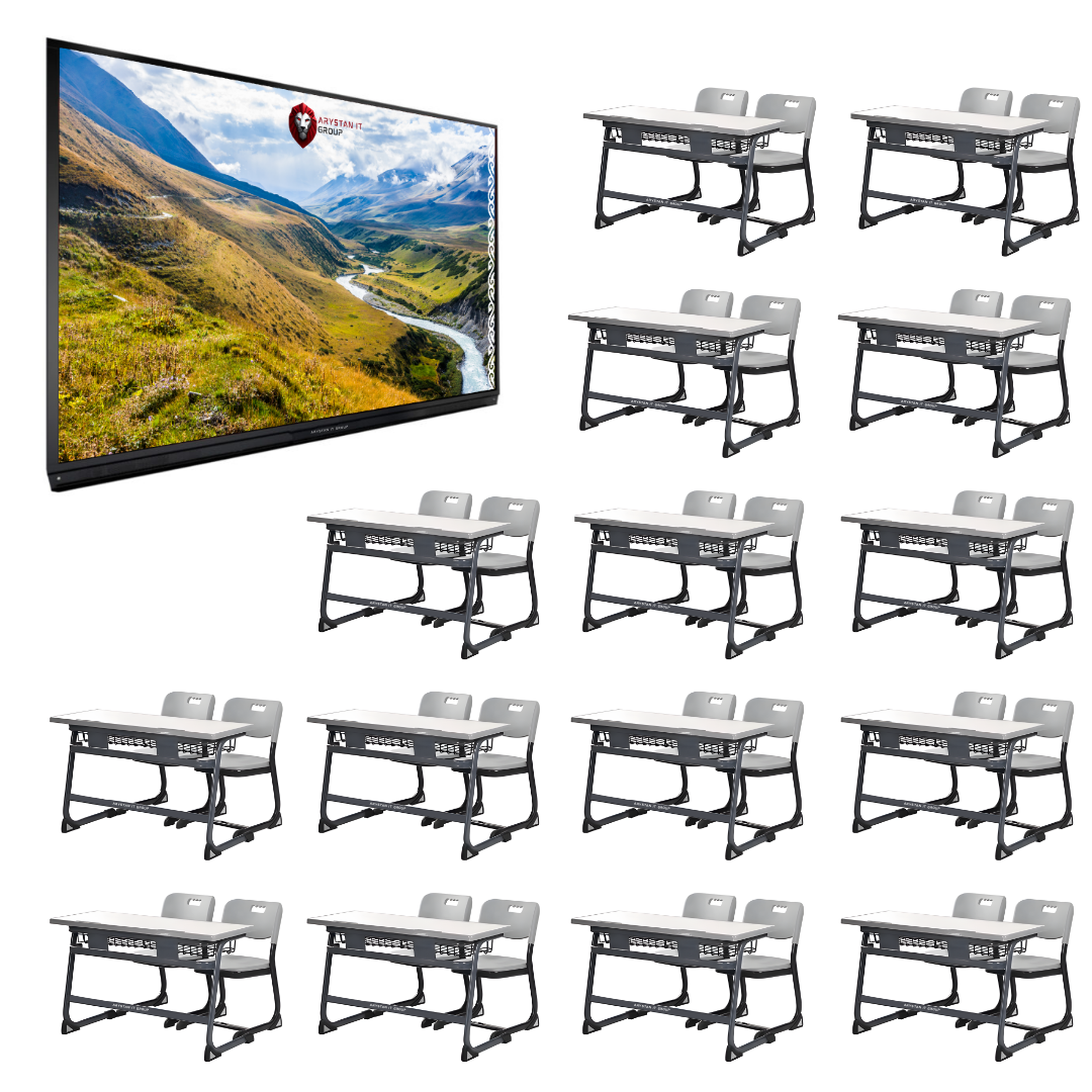 | Комплектация | Интерактивная панель 75 — 1 шт, Парта двухместная PL-Ch — 15, в комплекте со стульями — 30 |