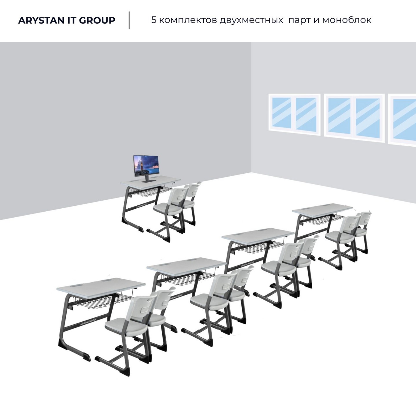 | Комплектация | Моноблок ARYSTAN 24 I312-8GB-512GB — 1 шт, Парта двухместная "ARYSTAN IT GROUP" PL-Ch — 5, в комплекте со стульями — 10 |